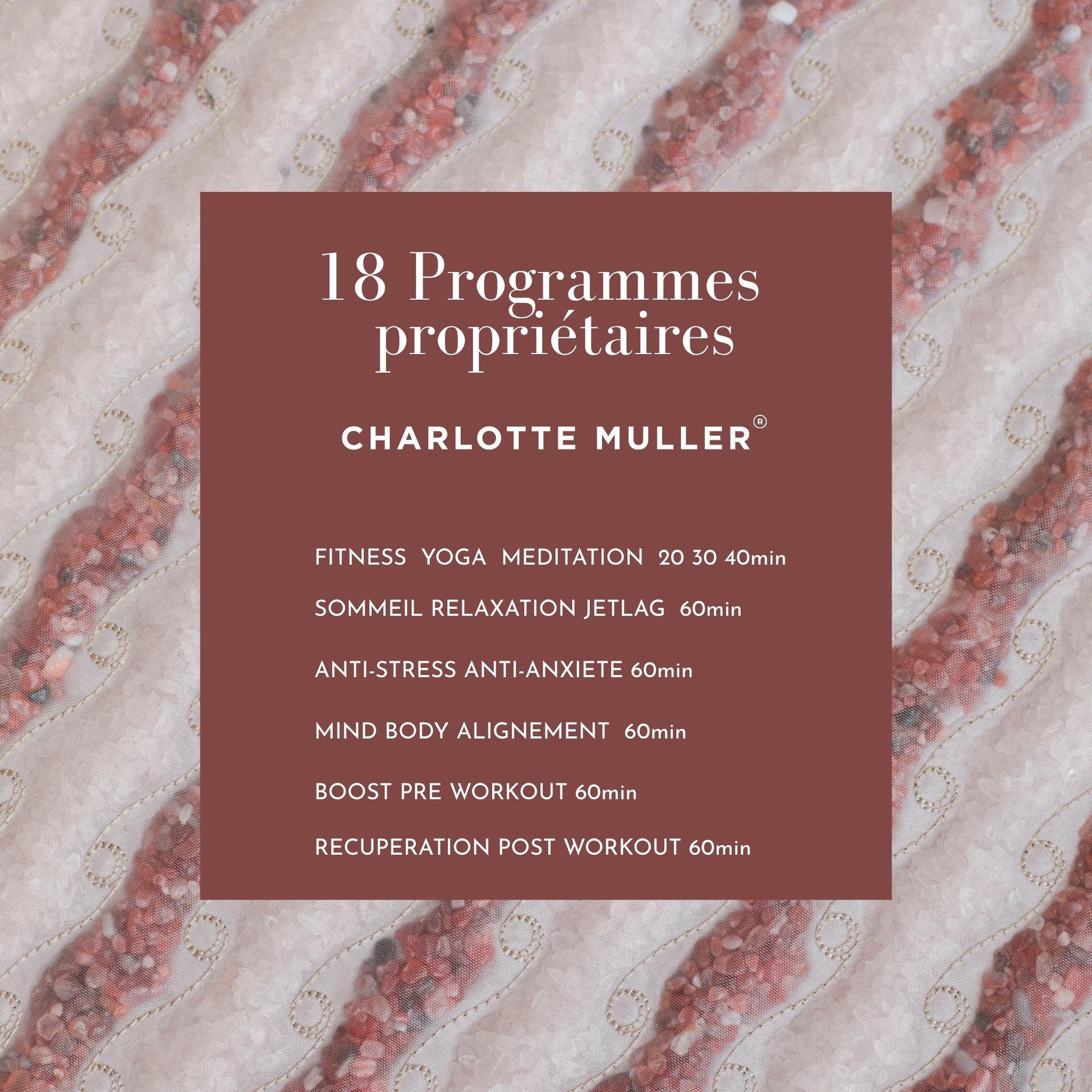 17 programmes d'hertz oscillantes propriétaires de 20 à 60 minutes pour accompagner votre pratique de Fitness, Yoga, Wellness & Meditation sur la plateforme video Studio Digital Charlotte Muller Method.